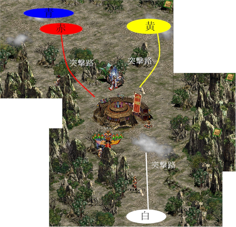 相手の配置を確認したところ上の図のような感じだったのでw 作戦変更。右上より全軍にて攻めることにしました。